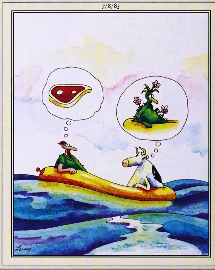 Este es otro grande de todos los tiempos. Lado lejano panel, tanto por la efectividad de su remate sin palabras como por sus imágenes memorables. En esta caricatura, un hombre hambriento y una vaca hambrienta atrapados juntos en una balsa salvavidas se miran y ven una comida. Para el ser humano, esto es bastante sencillo, ya que imagina un filete; la vaca, por el contrario, imagina hilarantemente al hombre como un montículo de hierba.