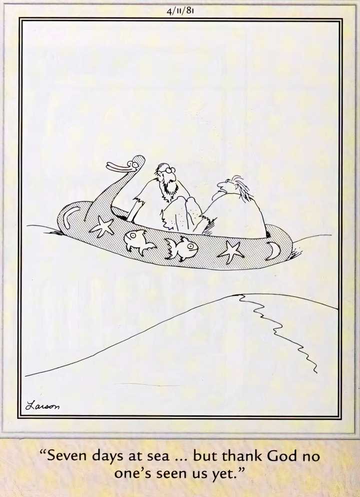 Siete días en el mar“, dice uno de ellos, “pero gracias a dios nadie nos ha visto todavía.“Este es un ejemplo del hábito de inversión característico de Gary Larson; los lectores pueden asumir con seguridad que la ilustración se derivó de la premisa del chiste aquí, ya que Larson buscó visualizar la respuesta a la pregunta de qué haría que los personajes perdidos en el mar se desesperaran no encontrar, en lugar de lo contrario esperado.
