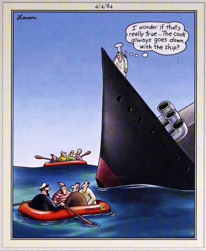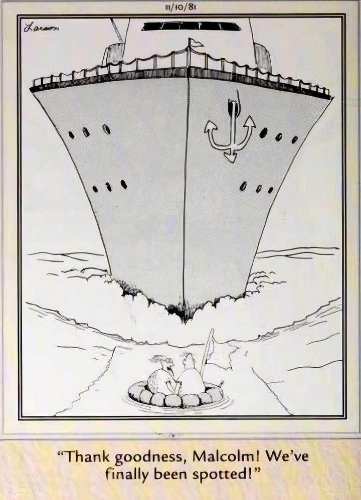 en esto Lado lejano panel, una pareja perdida en una pequeña balsa salvavidas se encuentra con un barco – excepto que es un enorme crucero que se dirige directamente hacia ellos, lo que seguramente los atropellará; de lo contrario, la estela del barco seguramente volcará su balsa.lo que llevó a su desaparición casi segura. Dicho esto, Gary Larson ofrece una vez más una explicación sobre un remate familiar: la incongruencia de la percepción de los personajes y la realidad de lo que les está sucediendo.