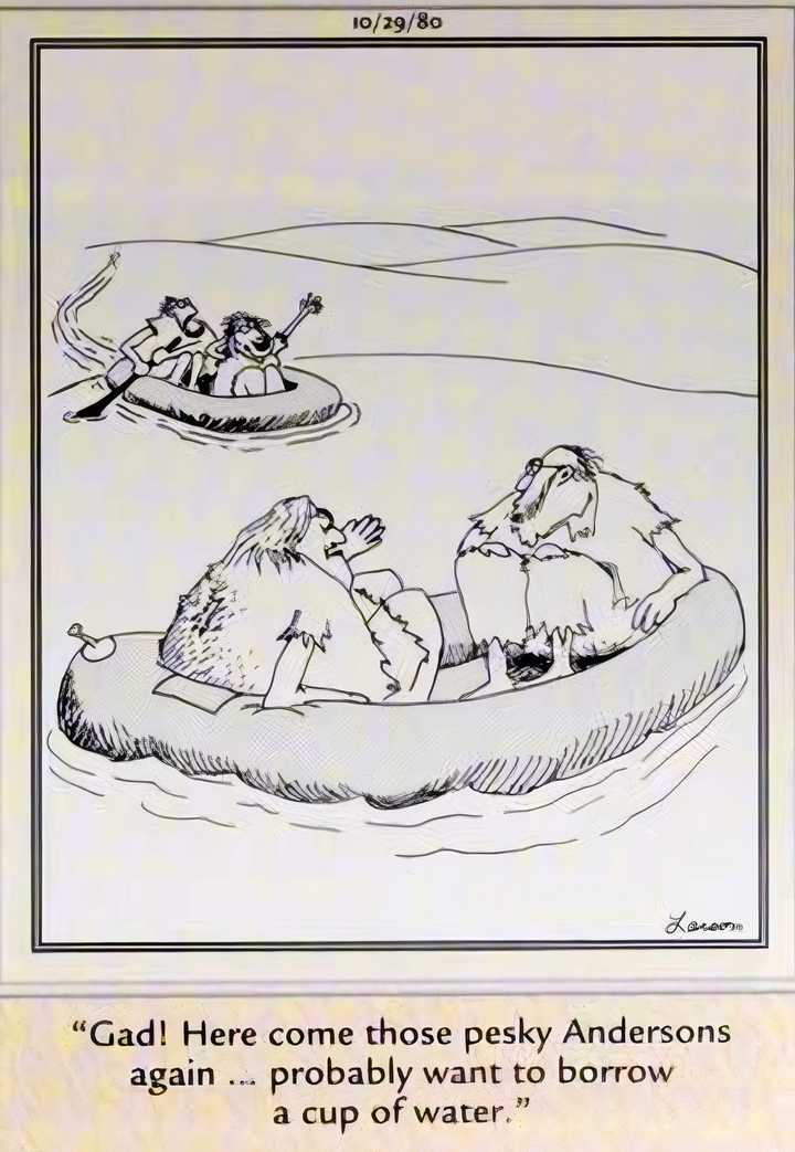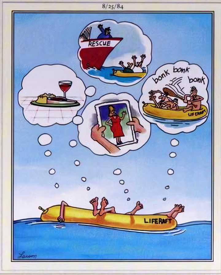 Este es uno de los más sutiles de Gary Larson. Lado lejano chistes, especialmente cuando se trata de la cepa “perdido en el mar” de lado lejano dibujos animados. Aquí, un grupo de sobrevivientes están esparcidos en una balsa salvavidas inflable, con solo sus extremidades visibles colgando por el costado, mientras cada una de sus fantasías se visualiza en burbujas de pensamiento sobre la balsa. Naturalmente, uno sueña con un rescate, otro con una cena de carne y una copa de vino, y otro con la foto de una mujer… mientras que el último se imagina golpeando a sus compañeros supervivientes en la cabeza.