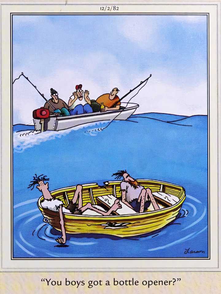 Mientras que muchos Lado lejano Los dibujos animados de “perdidos en el mar” encuentran el humor en personajes que no aprecian su propio peligro. En este caso, Gary Larson modifica ligeramente esa fórmula, que representa a un grupo de pescadores que se encuentran con dos hombres al borde de la muerte varados en el océano, e inmediatamente muestran una total falta de aprecio por la gravedad de su difícil situación..
