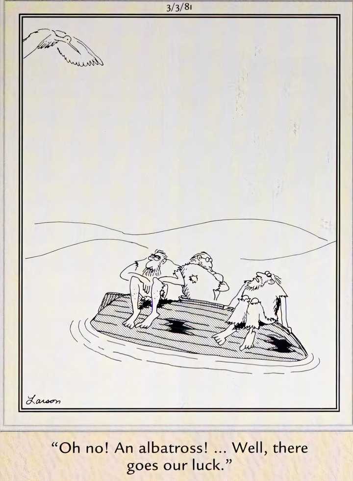 en el segundo Lado lejano En el panel “perdidos en el mar”, Gary Larson vuelve a encontrar humor en el contraste entre la situación y la respuesta de los personajes. Aquí, tres hombres sentados en un barco volcado, su casco está plagado de grandes agujeros, lo que lo hace quijotesco cuando uno de ellos ve un pájaro volando por encima y comenta: “¡Oh, no! ¡Un albatros! Pues ahí va nuestra suerte.“.