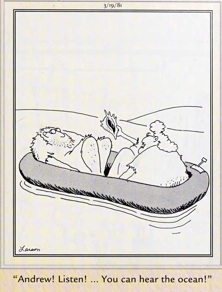 El otro lado es citado con razón por su tendencia hacia el humor absurdo, pero con la misma frecuencia, los chistes de Gary Larson pueden ser francamente ridículos. Ese es el caso de esta caricatura, como una mujer le tiende una concha a su marido y le dice: “¡Andrés! ¡Escuchar! ¡Puedes oír el océano!” – mientras flotan sin rumbo en medio de un mar desoladoesperando un rescate que quizás nunca llegue.