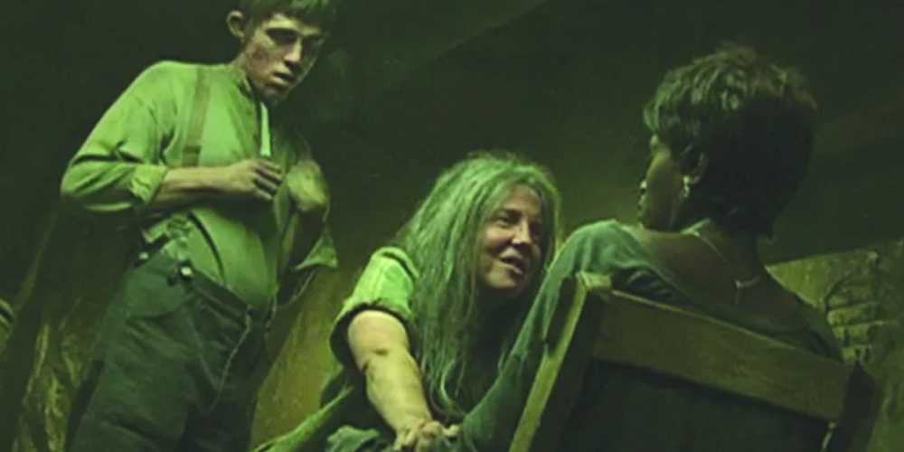Los Polk muestran este terror a través de sus horribles acciones, especialmente después de secuestrar a los protagonistas Audrey (Sarah Paulson), Lee (Adina Porter) y Monet (Angela Bassett), quienes luego se ven obligados a cenar con ellos. Las mujeres capturadas son torturadas para que coman carne extraída de las piernas de Lee, lo que crea una escena que retuerce el estómago y resalta el horror rural en su forma más extraña. Historia de terror americana no es ajeno a la sangre gratuitasiendo este momento un excelente ejemplo de ello durante la temporada más violenta de la serie.