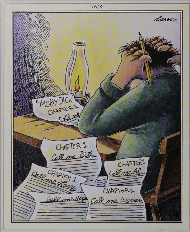 As any writer knows, perfection is the enemy of completion – especially when it comes to first, handwritten drafts; surely, if the Far Side version of Melville gets up and steps away from his desk for a few, perhaps going for a quick walk down to the marina, he’ll be more likely to find inspiration striking, and the right name for his narrator popping into his head after all that turmoil.