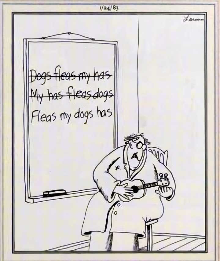 Readers who have strummed – or more accurately, tuned – a ukulele will recognize “my dog has fleas,” as a device used to help get the sound of each string precisely right. Evidently, this Far Side panel depicts the origin of this musical tradition, and in Gary Larson’s conception, it was more difficult than one might expect.