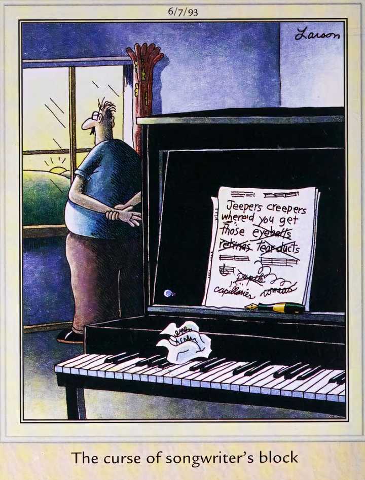 Hilariously, Larson repeats his trick of making the lyrics the man is struggling with familiar to the reader, meaning the joke derives from the fact that the solution to the man’s creative woes is right there in front of him, as he attempts to complete the line “Jeepers, Creepers, how’d you get those….” by cycling through a list of synonyms for “eyes,” without landing on the obvious, and iconic, “peepers.”