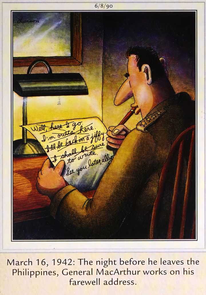 In one of The Far Side’s jokes ripped straight from the pages of a real history book, American General Douglas MacArthur can’t find the right words to start off a big speech he has to give the next day. Despite his heroics druring World War II, MacArthur’s legacy is complicated, particularly by his role as the military overseer of the Phillipines in the aftermath of the war.