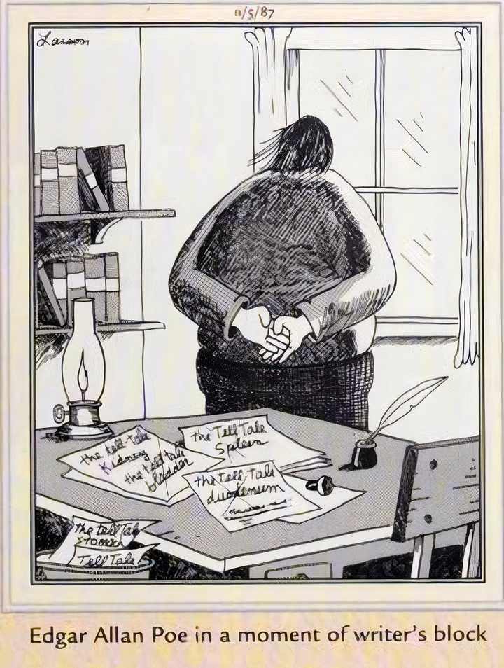 In a reprise of his earlier Herman Melville joke, Gary Larson depicts another famous writer struggling to get an iconic literary idea out on paper. Featuring “Edgar Allen Poe in a moment of writer’s block,” the author is depicted with his hands clasped behind his back, pensively staring out his office window, desk litered with crossed out variations on the title of what will eventually become “The Tell-Tale Heart.”