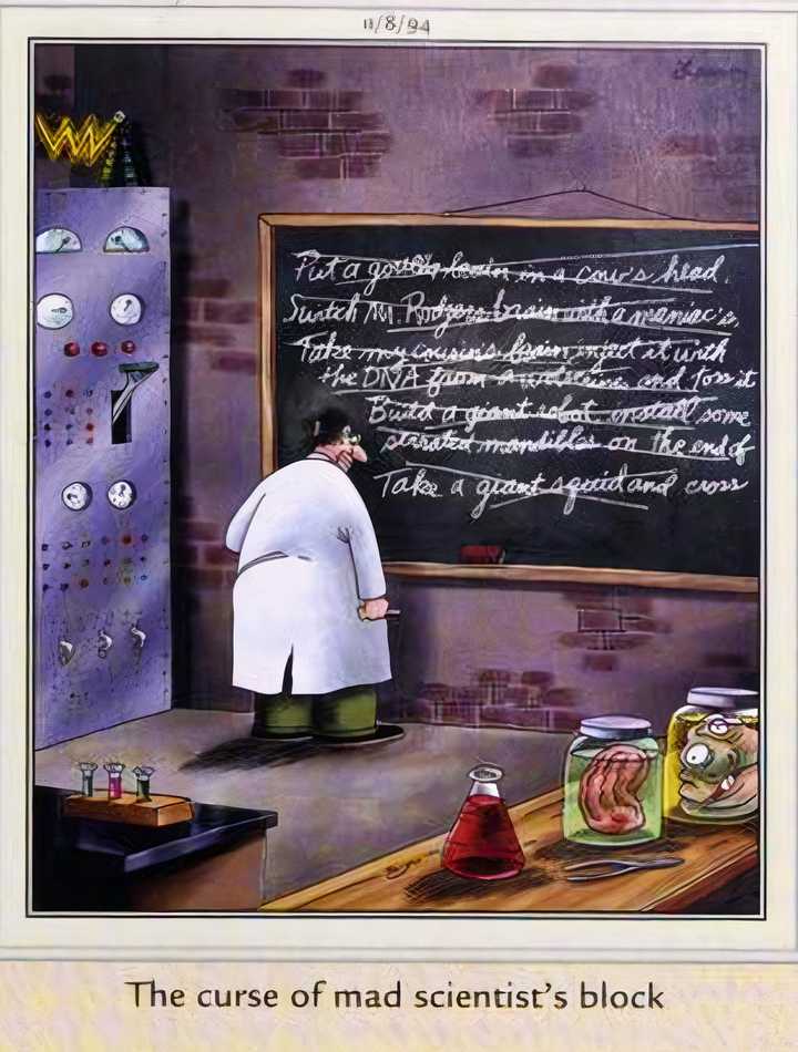 Though this panel depicts “the curse of mad scientist’s block,” it actually encapsulates Gary Larson’s creative process more precisely than any of his cartoons about writers. With Herman Melville and Edgar Allen Poe, Larson might have offered a general account of writing’s bleaker moments using specific examples, here he does the opposite, making a specific point about his own idiosyncratic work under the cover of a general “mad scientist” gag.