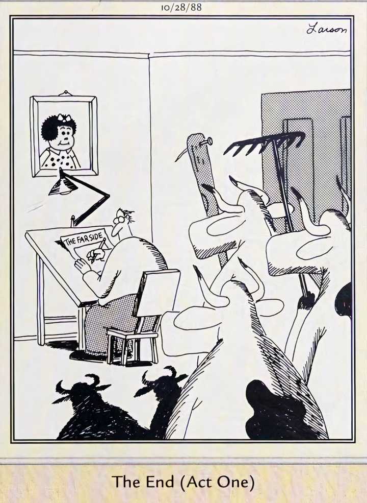 The Far Side had its share of fourth-wall-breaking jokes over the years, with this being a particularly memorable one, as it features a Far Side-style version of Gary Larson himself sitting at his desk writing The Far Side, only to turn around and discover a mob of weapon-wielding cows coming for him.