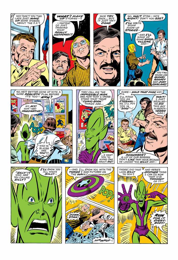 Estos documentos históricos luego se traducen en cómics que se venden a las masas. Jack Kirby sugiere que deberían inventar una historiapero, mientras discuten, su oficina es invadida por el increíblemente extraño Hombre Imposible. Stan hace una broma muy irónica de que recuerda a Impossible Man de una vieja historia que escribió y también recuerda cuánto lo odiaban los lectores. Una batalla entre los escritores de cómics y los enfermizos. Al estilo Duende Verdecriatura, lo que finalmente condujo a una victoria decisiva para los creadores del cómic.
