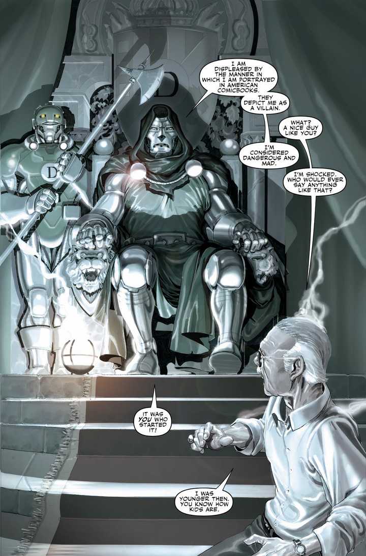 Stan retrocede asustado, un caso poco común en sus muchos cameos. Si Stan Lee no es un personaje secundario astuto, generalmente se lo retrata como el de un dios. Sin embargo, mientras Doom conoce el poder de Stan sobre el Universo MarvelDoom no tiene miedo de mirarlo a los ojos y exigir respuestas. Realmente, ninguna persona está a salvo del juicio del Doctor Doomni siquiera su creador.