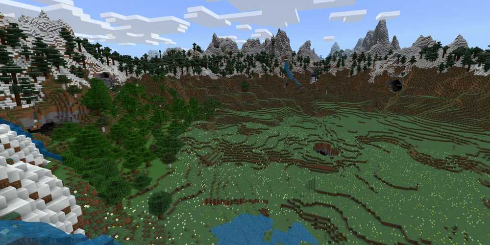 Discovered by Reddit user u/QibliTF, this seed spawns you on the edge of a giant meadow surrounded by snowy mountains. It’s a dream for Creative Mode players, offering a scenic landscape that still acts as a perfectly blank canvas for building the largest structures you can imagine. However, Survival Mode players might also want to take a look.