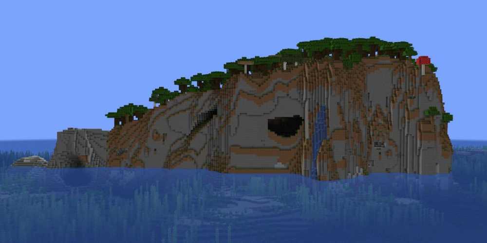 Island seeds tend to be quite flat. That’s why the Dark Forest Cliff Island at coordinates (0, 79, -25) is a nice change of pace. This highly elevated island features a Dark Forest biome. As a result, not only are tree trunks 2×2 blocks thick, but there are also plenty of mushrooms to be harvested.