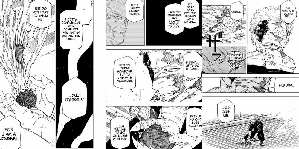 Fue sólo porque la fuerza de Sukuna le falló en la batalla final que pudo reconocer otra alternativa. Como Sukuna le dice a Mahito en el capítulo 271, su derrota es lo que lo llevó a darse cuenta de esto, lo que demuestra que Yuji efectivamente le enseñó a Sukuna sobre el amor verdadero al final, siendo Uraume quien lo hizo aceptarlo.