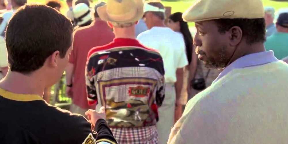 Feeling more comfortable carrying his own clubs, Happy just tells the young man to make sure he doesn’t do anything stupid. When moments later, Happy inadvertently stands in the tee box, blocking his opponent, he immediately calls out the caddy for failing at his job. It is hilarious how quickly Happy’s amicable view of this young man disappears. The way Sandler stares at his caddy for a few more seconds with rage in his eyes shows that he is not someone who likes being embarrassed.